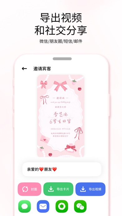 電子請柬製作APP可讓您免費、輕鬆、快速地邀請好友。 使用我們的免費模板,製作婚禮邀請,生日邀請,周歲宴,滿月宴,喬遷,壽宴,滿月宴等等。 海量精美動畫請柬,助你的邀請函脫穎而出! 如何使用APP • 選擇一個免費的在線邀請卡片,生日派對、滿月宴、周歲宴、訂婚宴、婚禮、百日宴、結婚請柬、升學宴、壽宴、商務邀請、聖誕節、情人節、感謝卡等 • 上傳照片、視頻和音樂,讓請柬更生動 • 編輯字體樣式,讓請柬充滿藝術感 • 可以分享到微信、朋友圈、Facebook、WhatsApp、LINE、WeChat、SMS等 • 當好友在請柬中回複,立刻收到通知 • 一鍵下載請柬卡片 • 輕鬆導出視頻格式分享抖音,小紅書收獲更多美好祝福 • 實時查看賓客瀏覽記錄 • 發送私人請柬更具儀式感 • 宴會地址一鍵導航 【訂閱說明】 1.付款:用戶確認購買並付款後記入iTunes賬戶 2.取消續訂:如需取消續訂,請在當前訂閱到期24小時以前,手動在iTunes/Apple ID 設置管理中心關閉自動續訂功能 3.續訂:蘋果iTunes賬戶會在到期24小時內扣款,扣款成功後訂閱周期順延一年 4.隱私政策:https://www.invit.vip/privacy-policy 6.訂閱協議:https://www.invit.vip/subscribe 7.服務條款:https://www.invit.vip/agreement