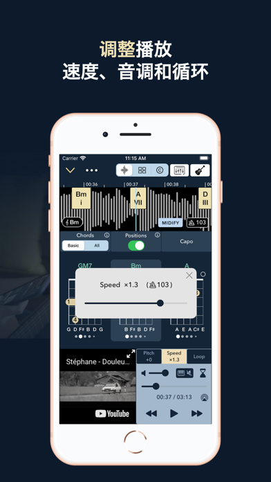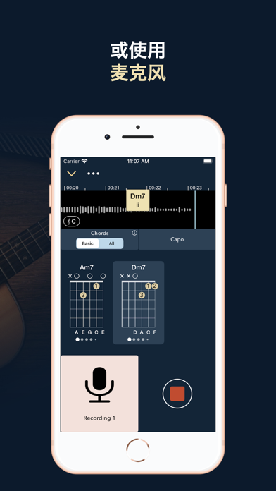 針對從初學者到專業人士的音樂家的隱秘寶藏。 Chord ai使用最新的人工智能技術自動可靠地為您提供任何歌曲的和弦、節拍和和聲。您不再需要在網上尋找歌曲的和弦。Chord ai會即時監聽從您的設備或周圍播放的音樂並顯示出和弦。Chord ai提供了許多功能,幫助您學習和演奏所有您最喜愛的歌曲。請看下麵Chord ai的一些主要特點。 *** 瀏覽任何歌曲 *** - 您可以通過瀏覽音頻文件、SoundCloud或YouTube選擇任何歌曲。這是首選的方式,Chord ai會在幾秒鍾內處理所有歌曲。 - 您還可以在Apple Music或Spotify等流媒體服務中找到歌曲。在這種情況下,Chord ai將使用麥克風實時處理您設備中的聲音) - 您還可以使用設備麥克風處理您周圍播放的任何歌曲或自己的演奏。 *** 和弦識別 *** - 常見和弦識別:Chord ai可以識別許多常見的和弦,如大調、小調、增強、減弱、7和弦、M7和弦、sus2和sus4和弦。 - 高級和弦識別:Chord ai還可以識別高級和弦,如電吉他和弦、半減、dim7、M7b5、M7#5、6、69、9、M9、11、M11、13、M13、add9、add11、add#11、addb13、add13、7#5、7b5、7#9、7b9、69、11b5、13b9等等!(如9sus4、min7add13等的組合) - 和弦倒置,也稱斜線和弦:如C / E,其中第三個音(E)作為最低音演奏,或Am7 / G,其中第七個音(G)作為最低音演奏。 *** 聲部/位置識別 *** - 聲部和位置識別:Chord ai是世界上第一個可以識別不僅和弦,還有它們特定聲部的應用程序。這意味著Chord ai可以更準確地告訴您,包括其八度的哪些音符在鋼琴上演奏,或哪些吉他/尤克裏裏位置最適合這首歌曲 *** 節拍跟蹤 *** Chord ai 使用先進的節拍和下拍跟蹤算法,將和弦組織成小節和節拍。 *** 高級重放控製 *** - 速度變化: 慢放或加速歌曲播放,以便您可以輕鬆地跟著歌曲演奏 - 音高變換:改變歌曲的音高以演奏您想要的調式 - 循環播放:很容易設置循環播放點 *** 鋼琴/吉他/尤克裏裏 *** - 選擇您喜歡的樂器,包括鋼琴、吉他或尤克裏裏 - 您可以瀏覽Chord ai為吉他和尤克裏裏的和弦位置建立的龐大庫存 - 對於吉他或尤克裏裏,您可以選擇卡波值 - 智能卡波:您還可以讓Chord ai為易演奏或匹配歌曲的首選卡波 *** 保存和分享 *** - 保存您最喜歡的歌曲的轉錄,以便在您的任何iOS設備上檢索 - 分享轉錄文件作為PDF文件或鏈接 *** 學習新的美妙和弦排布 *** - 在 Chord ai 的大量和弦排布庫中查找和學習和弦(超過 10 萬種吉他排布和 10,000 多種尤克裏裏排布) - 排布按易於和常見性從簡單到困難和罕見排序 - [專業版] 吉他和尤克裏裏的替換調弦,例如 Drop D,DADGAD,Open D/G/A/C 等 *** 功能完整的音樂播放器 *** - 創建自己的播放列表 - 背景音頻支持 - 離線收聽您的音樂 歡迎發送反饋至 contact@chordai.net 隱私政策:https://chordai.net/privacy-policy/ 使用條款:https://www.apple.com/legal/internet-services/itunes/dev/stdeula/