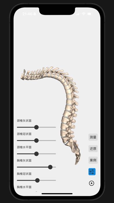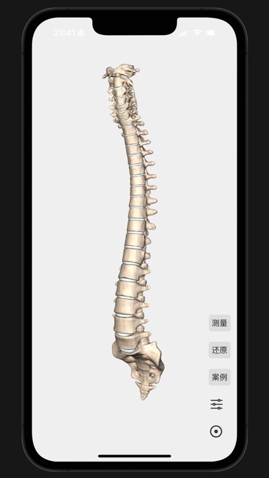脊柱側凸 (scoliosis)俗稱脊柱側彎,是指脊柱的一個或數個節段向側方彎曲或伴有椎體旋轉的脊柱畸形。 脊柱X線平片顯示脊柱有大於10%的側方彎曲,即可診斷為脊柱側凸。此疾病好發於青春期,隨年齡增加症狀逐漸加劇,嚴重者影響呼吸、心髒功能,甚至出現脊髓壓迫及癱瘓現象。 脊柱側凸多見於青少年,中國脊柱側凸發病率為1.04%~1.2%,美國普查該病發病率約為1.1%。女性患者多於男性。各類型脊柱側凸中,特發性脊柱側凸最多,約占脊柱側凸總數的75%~80%,其次為先天性脊柱側凸。 本應用可以通過3D脊柱模型快速模擬各類脊柱側彎病例,可以通過頸椎、胸椎、腰椎的冠狀麵、矢狀麵、水平麵三個軸向去任意調節椎體的角度,從而簡單明了的模擬出各種脊柱側彎案例,並且展示給相關患者查看。 應用包含常見的5種脊柱側彎典型病例 King I型 約占13%,胸彎和腰彎均超越中線呈“S”型,腰彎大於胸彎,且柔軟性較差。 King II型 約占33%,胸彎和腰彎均超越中線呈“S”型,胸彎大於腰彎且柔軟性小於腰彎。穩定椎常為T11或T12或L1。 King Ⅲ型 約占33%,為真胸彎腰彎不超越中線,且腰彎呈非結構性,站立位上腰彎一般無旋轉。 King Ⅳ型 約占9%,為長弧胸彎頂椎在胸段,通常在T10下終椎在腰段,L4傾斜進入該長胸彎內,外觀畸形明顯,但L5仍位於骶骨中央。 King Ⅴ型 約占11%,雙胸彎。為結構性,T6常為兩彎交界椎。 脊柱,作為人體的力學支撐中軸,其任何病變或發育異常,都會給人體活動帶來極大不便。在骨科臨床上,為了矯正脊柱異常,常需要影像學檢查、劃線、測量、評估其力學平衡,製訂治療與康複方案。 應用包含脊柱測量功能 1、椎體角 胸椎X線正位片上,脊柱側彎最凸出椎體上下緣切線延線的夾角。 正常時,接近於0°,角度越大,說明側彎越嚴重。 可用於術前、術後療效的評價。 2、椎間盤角 胸椎X線正位片上,脊柱側彎最凸出椎體下緣與其下方相鄰椎體上緣切線延長線的夾角。 正常時,接近於0°,角度越大說明側彎越嚴重。用於脊柱側彎校正術療效評價。 3、肋椎角 正位X線片上,先劃出脊柱側彎最凸出椎體的上緣垂直的縱軸線,再劃兩側肋骨頭和肋骨頸中點的連線,兩者的夾角為肋椎角。 正常時,雙側肋椎角之差接近於0°,當二者之差>20°時,表示脊椎側彎進行性加重。 4、Ferguson角 正位X線片上,側彎起始椎體、終末椎體與最凸椎體中心點連線的夾角。 正常時,接近於0°。 此角反映了側彎的程度,可用於評價側彎的治療效果。 5、胸椎旋轉測量法 脊柱側彎時,若伴有椎體旋轉,則可用此法評價旋轉程度。在正位X線片上,根據椎弓根影與椎體寬度等分線的關係分為4度: I度,椎弓根線越過外1/3線 II度,椎弓根線越過外2/3線 III度,椎弓根線到達椎體中線處 IV度,椎弓根線越過中線,到達對側 6、Cobb角 Cobb 角,是脊柱側彎測量中使用最廣泛的一個指標,幾乎成為評價脊柱側彎的金標準。可用於頸、胸、腰脊柱各個節段。 脊柱側彎:是指脊柱的一個或多個椎體向側方彎曲,並伴有椎體旋轉的脊柱畸形。一般整個脊柱呈C形,或者多處側彎而呈S形,其中側彎角度最大的一個叫主彎。 端椎:是指脊柱側彎段,上方向脊柱凹側傾斜最大的椎體,也叫頭椎或上端椎。 尾椎:是指脊柱側彎段,下方向脊柱凹側傾斜最大的椎體。也叫下端椎。 頂椎:是指脊柱側彎段,最凸出的一個椎體。 7、脊柱平衡相關測量和劃線 脊柱平衡,矢狀位上,頸7椎體中點的鉛垂線,正常時,向下應經過骶1椎體後上緣。在冠狀位上,脊柱處於人體正中線上。 幾個相關概念: C7PL:指頸7鉛垂線,是經頸7椎體中點向下引的一條與水平麵相垂直的線。 SVA/S-C7D:矢狀麵偏移,又稱骶-C7距,是指C7PL與骶1後上角的距離 。 SFD:骶股距,骶骨後上角垂直線和股骨頭中心軸的水平距離。 TK:胸椎後凸角,是胸4上緣延長線和胸12下緣延長線的夾角。 LL:腰椎後凸角,是腰1上緣延長線和腰5下緣延長線的夾角。